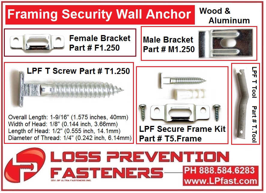Picture FramingSecurity Picture Frame Hardware & Supplies: Security T Head Locking Picture Hangers, T screw components, kits and security wrenches for framed arts. Aluminum and wood anti theft screws, hangers and solutions.